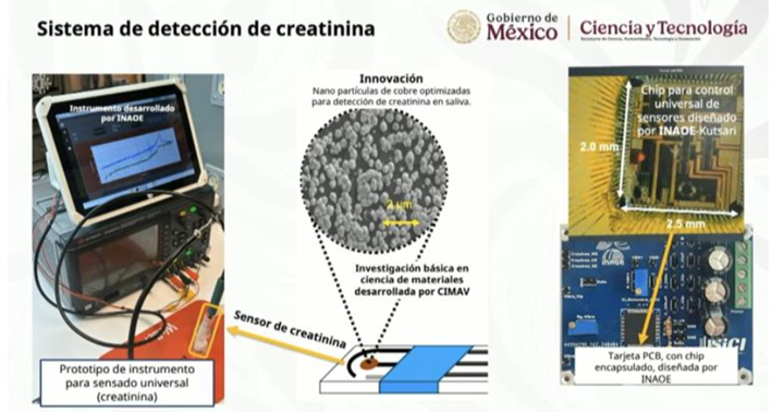 Así mismo presentó como un ejemplo de Innovación colaborativa, el Prototipo de instrumento para la detección de concentración de creatinina en saliva, en donde se articuló la participación de los Centros de Investigación CIMAV e INAOE, entre otras instituciones, conjuntando el conocimiento de investigación básica en ciencia de materiales con el desarrollo tecnológico de un chip específico para la aplicación, que integra las funcionalidades de lectura y procesamiento, logrando generar un prototipo funcional para solucionar un problema específico de salud, con el cual se podrá anticipar la posible aparición de enfermedades derivadas de deficiencia renal.